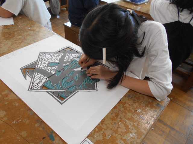 図工の様子です。スポーツフェスティバルで使う法被の文字を作成しているところです。
