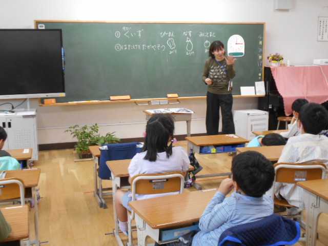 今日から給食が始まります。給食の事前指導を行っているところです。